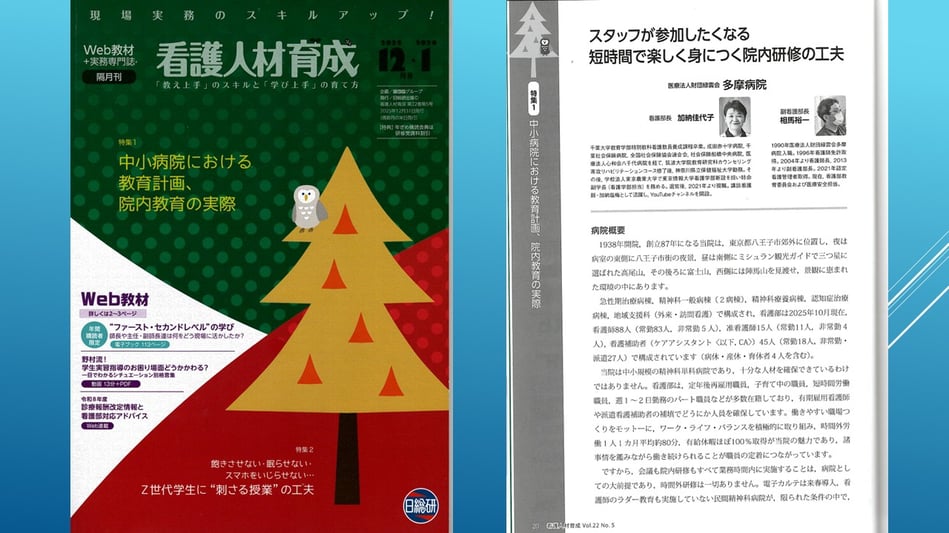 雑誌「看護人材育成」の特集「中小病院における教育計画・院内研修の工夫」に多摩病院のささやかな工夫を寄稿しました。